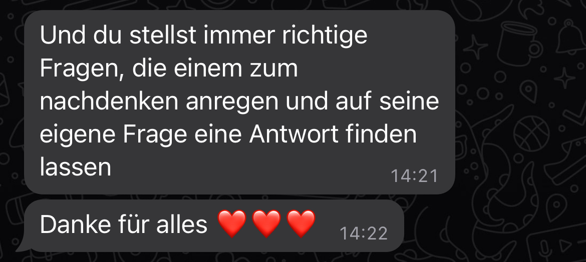 „Zur Zeit ist eine richtig, richtig stressige Zeit. Ich bin am Tag 16 Stunden am Arbeiten. Ich habe das Gefühl alles ist zu viel. Ich habe einen Stein auf meiner Brust liegen.Und es wird mir klar: ich bin so froh, auch wenn ich meistens vorher denke: „Boah, jetzt muss ich da hinfahren und wieder zurückfahren und danach noch Termine…“ ich bin so froh in diesem Gesangsunterricht. Der gibt mir richtig was. Es ist so befreiend, und meistens braucht es 1-2 Tage bis man es innerlich merkt. Es ist schön, jedesmal wenn ich ein Lied höre, dass ich im Gesangunterricht gesungen habe, denke ich mir: „Boah, geil!“ Und ich kriege direkt eine wesentlich bessere Stimmung.“